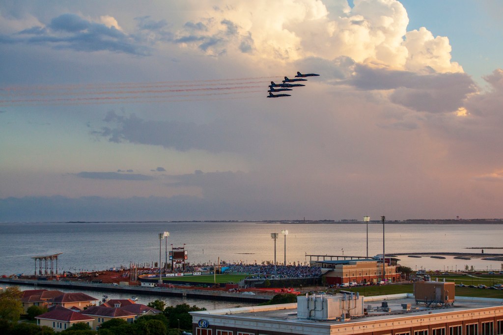 Blue Angels flight over the first Pensacola Blue Wahoos baseball game.